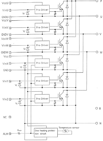 6MBP50JA120 absolute maximum ratings: (1)DC bus voltage VDC: min=0, max=450V; (2)DC bus voltage (surge) VDC(surge): min=0, max=500V; (3)DC bus voltage (short operating) VSC: min=200V, max=400V; (4)Collector-Emitter voltage VCES: min=0, max=600V; (5)Junction temperature Tj: max=150℃; (6)Input voltage of power supply for Pre-Driver VCC *1: min=0, max=20V; (7)Input signal voltage Vin *2: min=0, max=VzV; (8)Input signal current Iin: max=1mA; (9)Alarm signal voltage VALM *3: min=0, max=VccV; (10)Alarm signal current IALM *4: max=15mA; (11)Storage temperature Tstg: min=-40℃, max=125℃; (12)Operating case temperature Top: min=-20℃, max=100℃.
